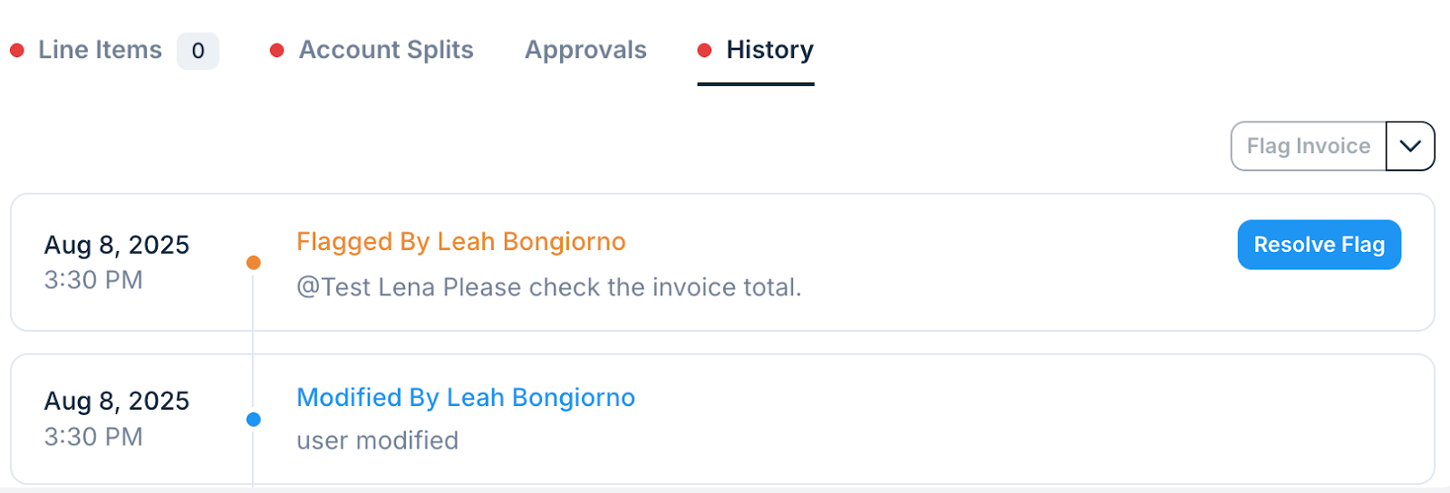 Invoice flagging is a feature that allows your team to easily track invoice issues. To flag an invoice, simply access the HISTORY tab and click on the FLAG INVOICE button (option under More also).