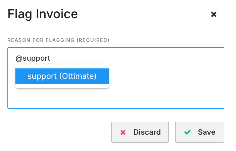 1. Internally (Ottimate does not get notified). A manager could flag an invoice because the goods listed in the invoice were not delivered. This will allow you to mention any user within your team to check (simply use "@" followed by their name).