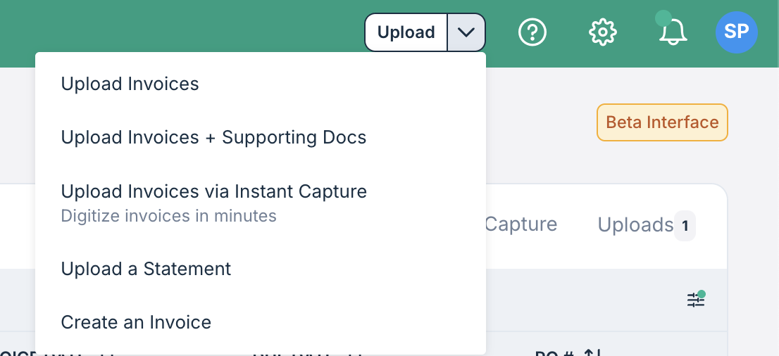 - Navigate to the invoice upload button (either top panel or on the homepage) and click the drop-down down menu.