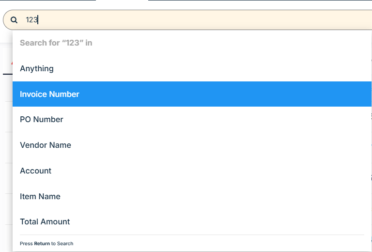 To search for an invoice, enter the invoice number, vendor name, amount, or item name in the search box at the top of the Invoices screen: