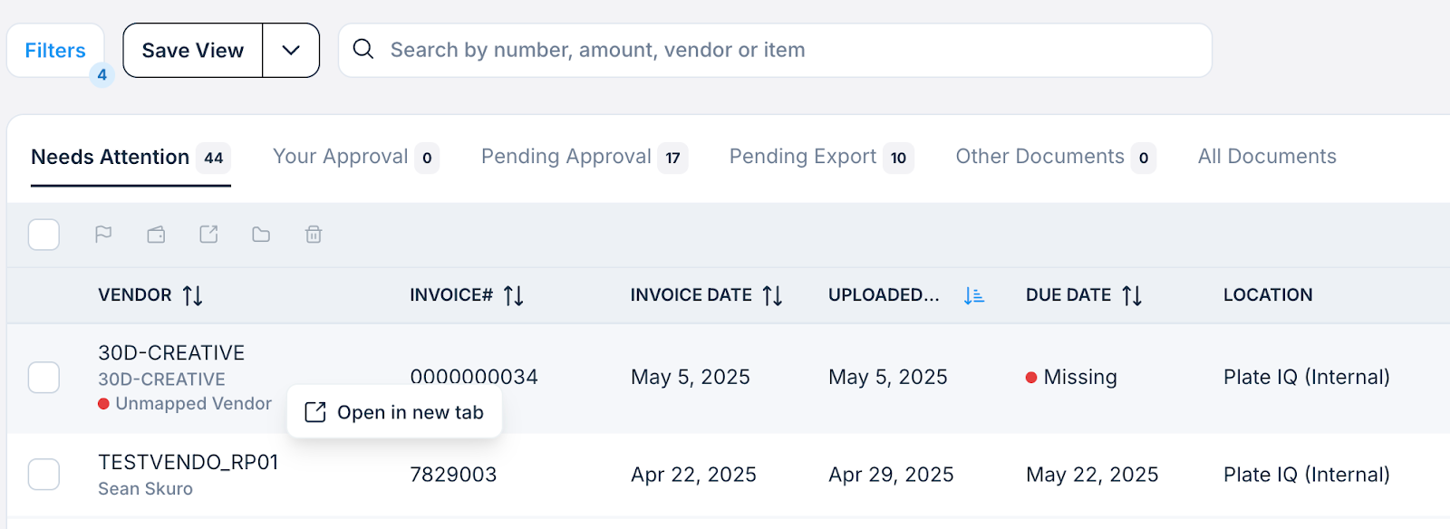 Right-click any invoice in the Invoice List View to open it in a new browser tab and easily view and compare multiple invoices without losing your place in the list.
