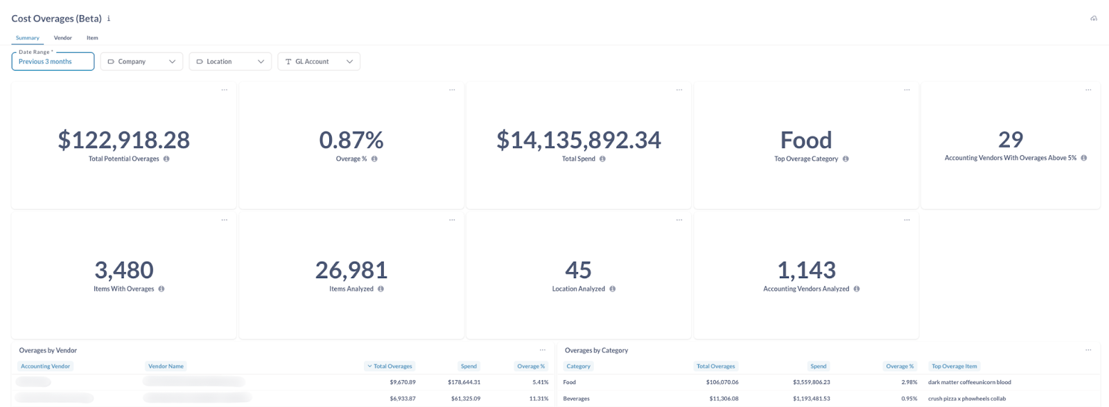 - Detailed analysis of items contributing towards the total overages. Can be filtered by location, category, vendor, and GL for further analysis