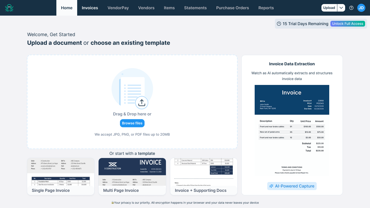 Drag and drop your invoice(s), or click “Browse Files” to search your computer for the invoice you’d like to upload. Alternatively, you can select a template for a single-page invoice, a multi-page invoice, or an invoice with supporting documentation to get started.