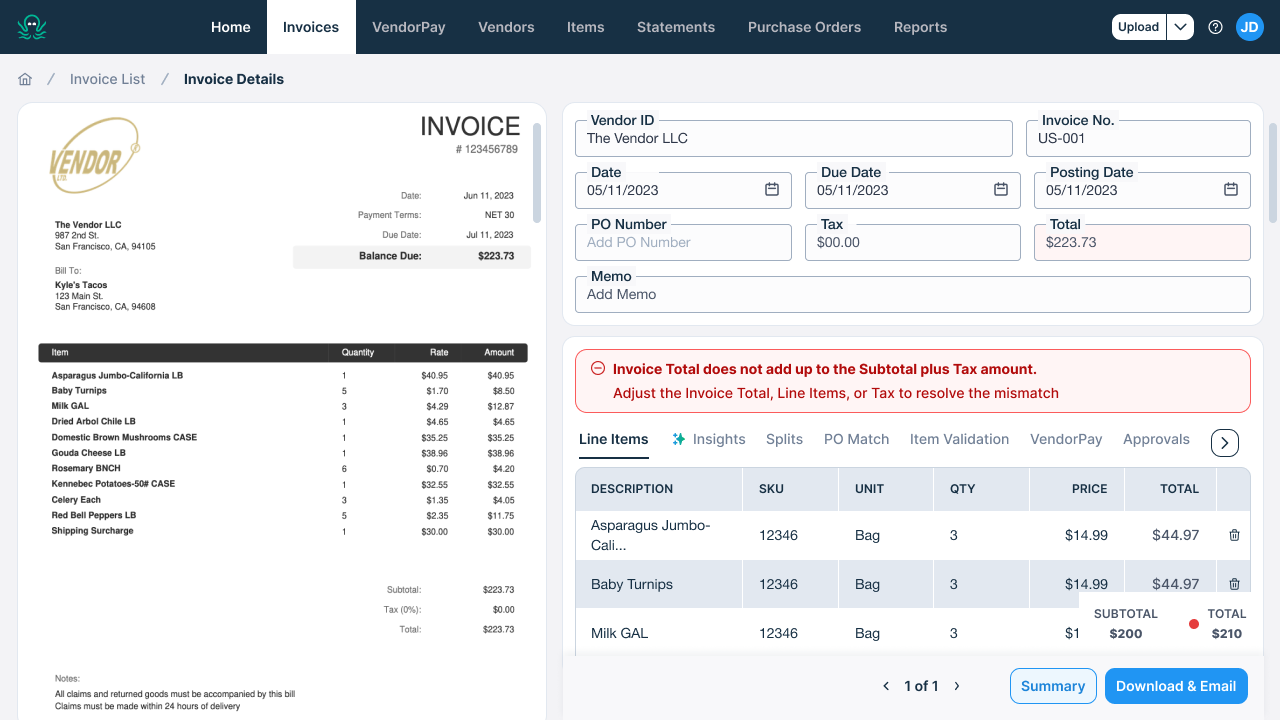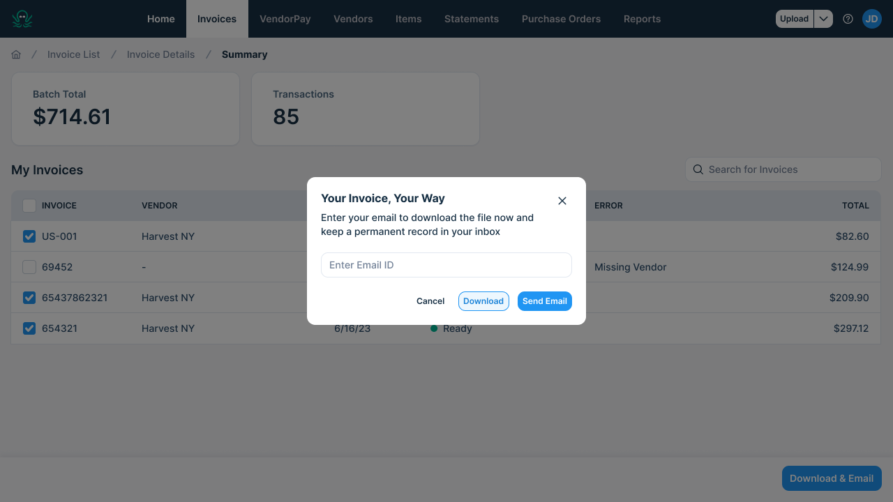 You can choose to Download, Email, or Download & Email your data from a single or multiple invoice(s). The file can be sent to multiple email addresses, separated by commas.